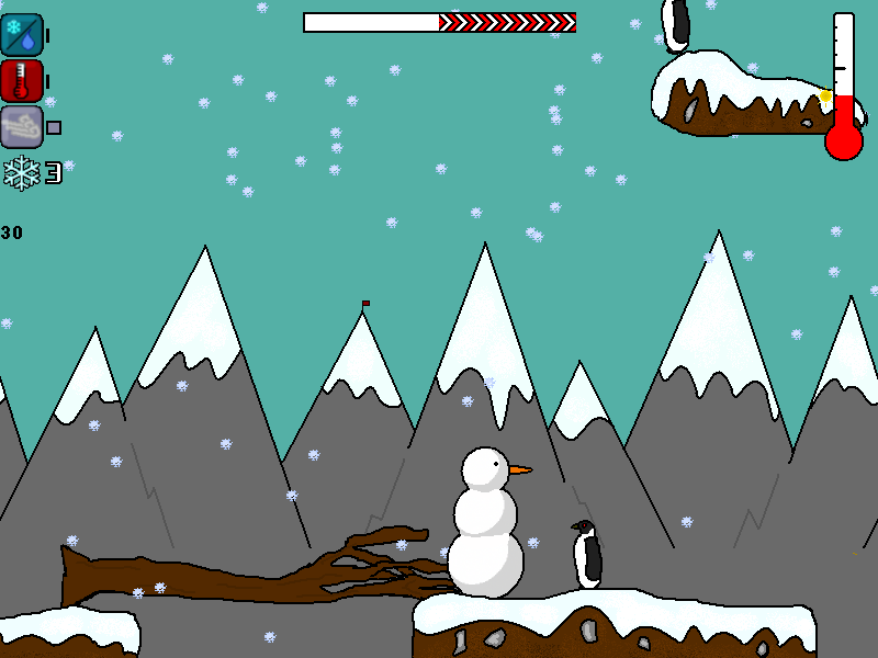 An evil man is creating a machine to destroy winter forever. You are a snowman with the powers of winter and you are out to stop the evil man! You start a journey from the North Pole to the equator. It will be harder and harder to stay alive in the rising temperature. Add to that the fact that all animals are hypnotised and try to kill you. Use percipitation, wind and tempeature to get past obsticals and to save winter!